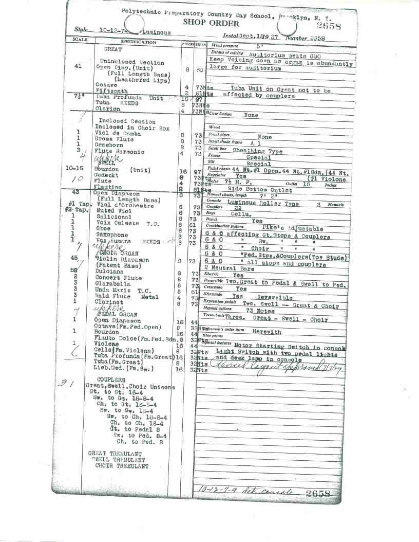 | Great 8 Open Diapason 8 Gross Flute* 8 Viol de Gamba* 8 Gemshorn* 4 Octave 4 Flute Harmonic* 2 Fifteenth 16 Tuba Profunda 8 Tuba 4 Clarion Tremulant (*enclosed with Choir) Pedal 16 Open Diapason 16 Bourdon 16 Violone 16 Lieblich Gedeckt (Sw) 8 Octave 8 Flauto Dolce 8 Cello 16 Tuba Profunda (Gt) 8 Tuba |