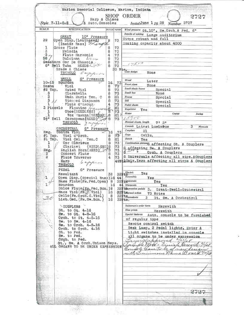 The organ fell mute in 1962. It was restored from 1975-76 by Marion native Thad Reynolds - honors student at Ball State University. The rededication date was set for Nov. 18, 1976 - just one day short of the anniversary of the original dedication.