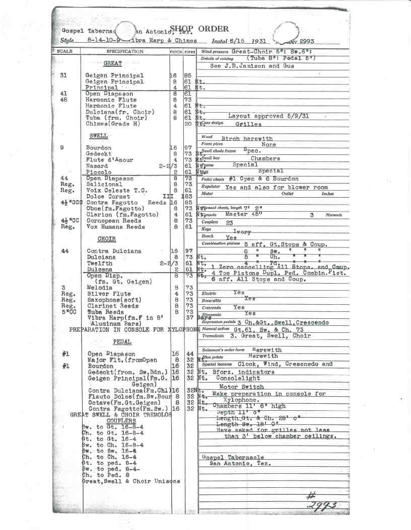 Choir 16 Contra Dulciana 8 Open Diapason (Gt Geigen) 8 Melodia 8 Dulciana 4 Silver Flute 2 2/3 Twelfth 2 Dulcena 8 Saxophone (labial) 8 Clarinet 8 Tuba Vibra Harp Xylophone (prep) Tremulant Ch to Ch 16-4 Ch Unison Off Sw to Ch 16-8-4 Pedal 16 Open Diapason 16 Bourdon 16 Gedeckt (Sw) 16 Geigen Principal (Gt) 16 Contra Dulciana (Ch) 8 Octave (Gt) 8 Flauto Dolce (Sw) 16 Contra Fagotto (Sw) Gt to Ped 8-4 Sw to Ped 8-4 Ch to Ped 8 |