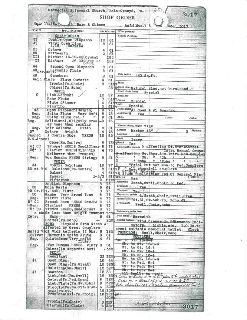 Swell 16 Lieblich Gedeckt 8 Open Diapason 8 Rohr Flute 8 Spitz Flute 8 Spiz Flute Celeste 8 Salicional 8 Voix Celeste 4 Octave 4 Flute d'Amour 2 Flautino 16 Contra Oboe 8 Trumpet 8 Oboe 4 Clarion 8 Vox Humana Termolo |