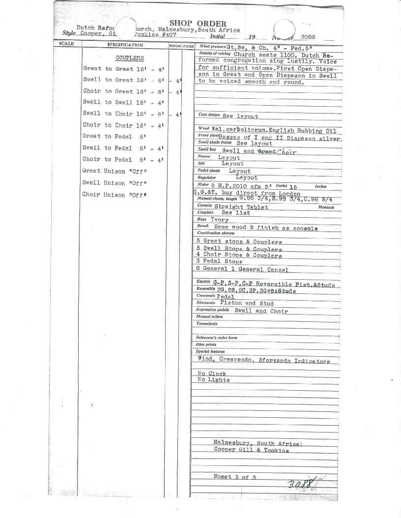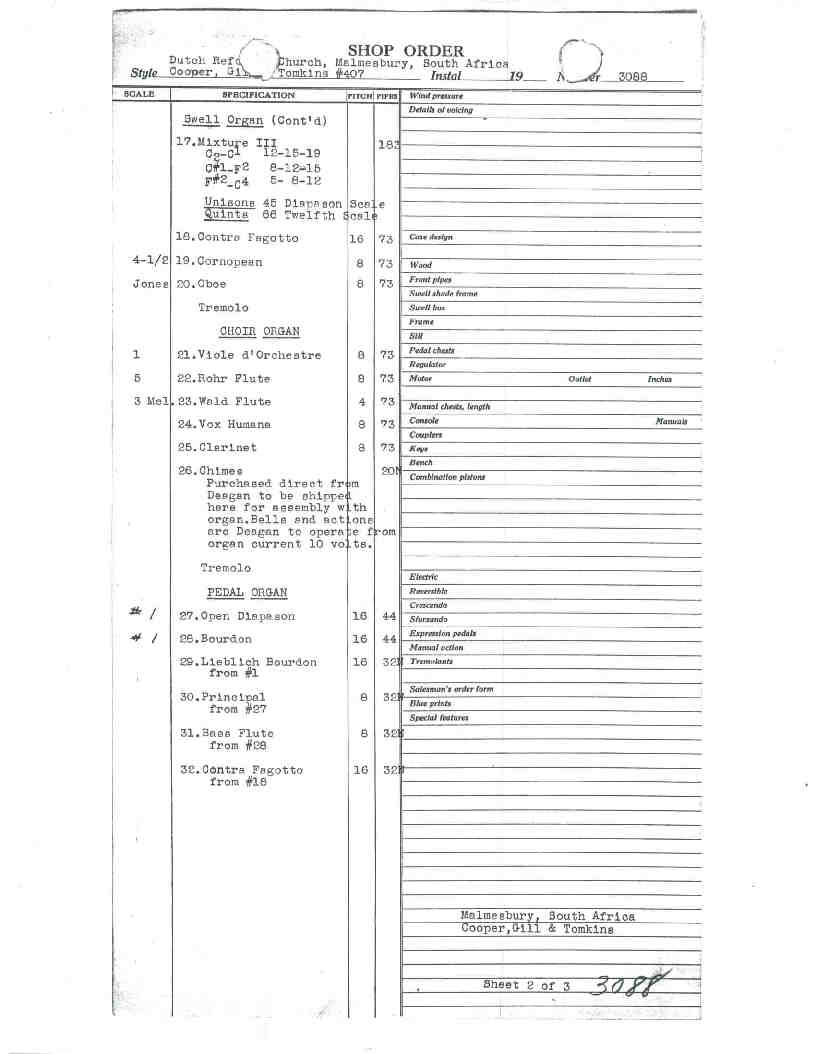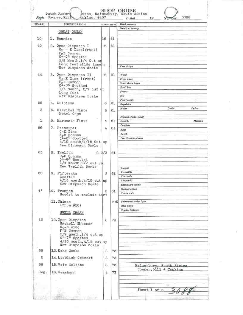 Note on Shop Order: "Church seats 1100.  Dutch Reformed Congregationa sings lustily.