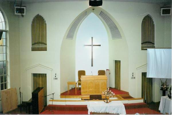 This organ was installed for the Estey Organ Corporation by Balcom and Vaughan of Seattle. It is located in two separate, adjoining chambers at the front of the room. The Great is on the right and the Swell is on the left. The front wall on both sides has a rather uninspired dummy facade of gold pipes. The actual shutter openings face into the recessed arch of the platform, and as a result the sound does not get into the rather large room very well.