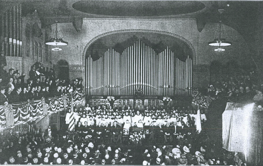 There have been few occasions in the history of this country when a President of the United States or a President-elect ha dedicated a new church organ. One of them took place at the Metropolitan Temple, Seventh avenue and Fourteenth street, New York, Sunday, when President-elect Taft was the principal speaker at the dedicatory exercises of the new McKinley Memorial Organ.  This instrument was built by the Estey Organ Co. It costs $8000, and Andrew Carnegie contributed largely to the fund for the purchase of the instrument. A picture of the interior of the church, showing the organ, President-elect Taft  and other celebrities present, is shown on this page.