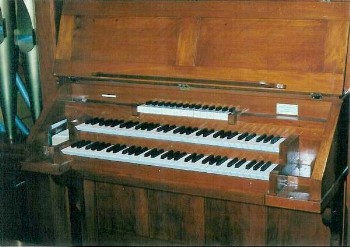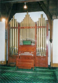The Estey pipe organ is an original installation, and happily remains tonally and mechanically unmolested. The instrument is free-standing and encased with an attached, projecting keydesk. The beautiful case is of cherry. The organ is placed on the front, left side of the chancel. The Pedal 16' Bourdon forms the sides of the case, but are not visible since the organ is recessed into a side room. The facade is divided into three sections arranged: 5 - 17 - 5. Of these 27 gold pipes, 17 are from the Great 8' Open Diapason.  The outer towers of five pipes each contain notes CC 1 through A 10 - diatonically divided. Notes 11 - 17 are located in the center flat of 17 pipes. The Great 8' Dulciana borrows its bottom 12 notes from the stopped wood basses of the 8' Melodia.